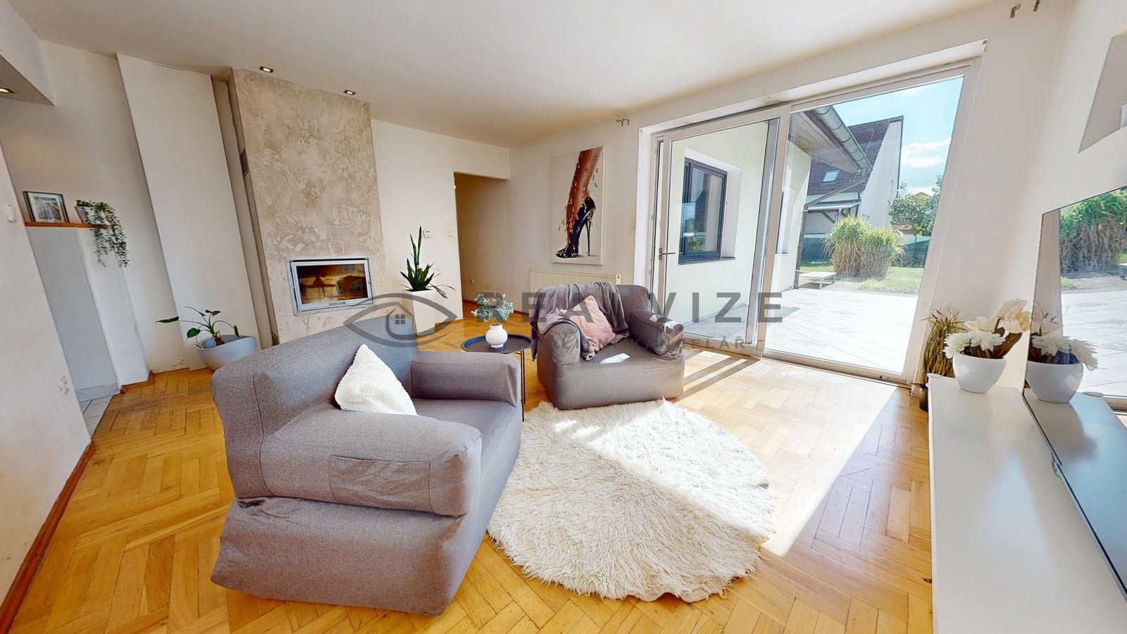 K domu náleží garáž, kterou lze projet z ulice do zahrady, terasa a zapuštěný bazén, ideální pro letní odpočinek.